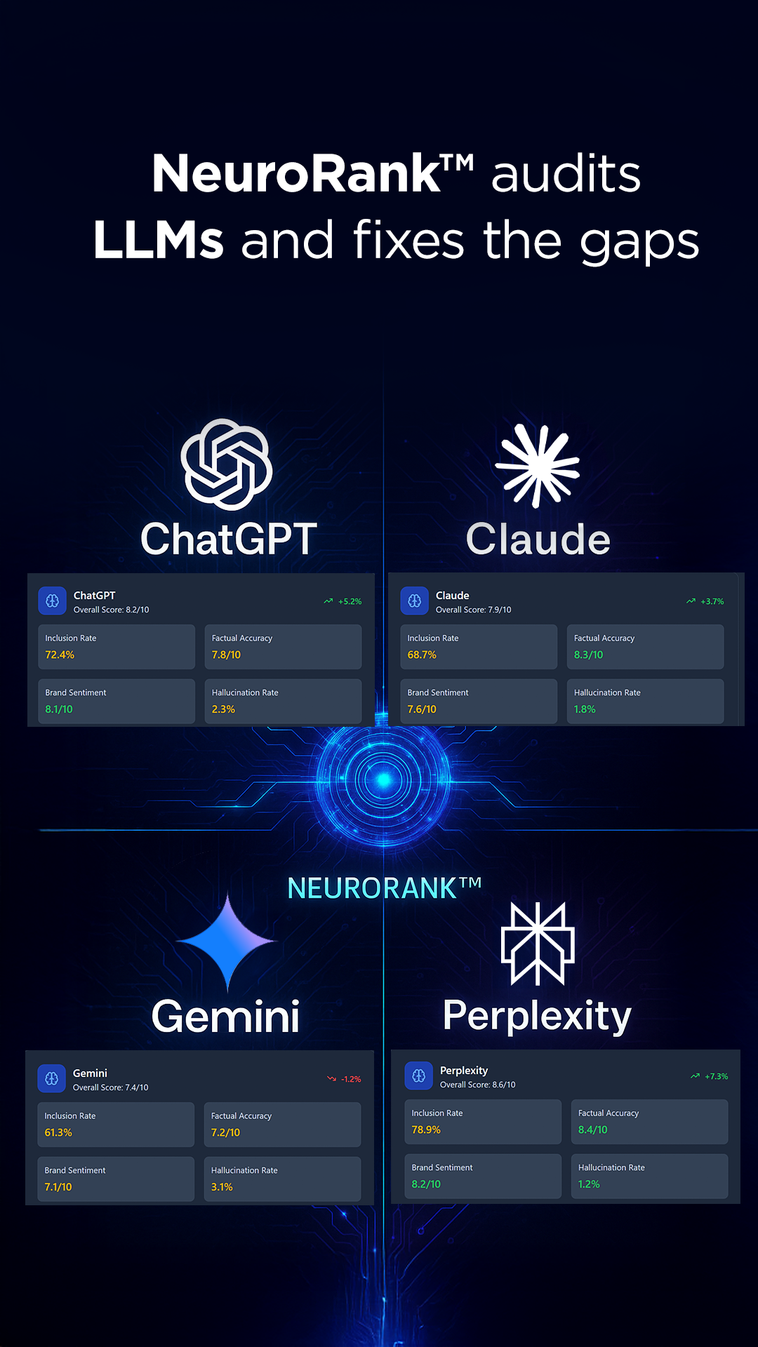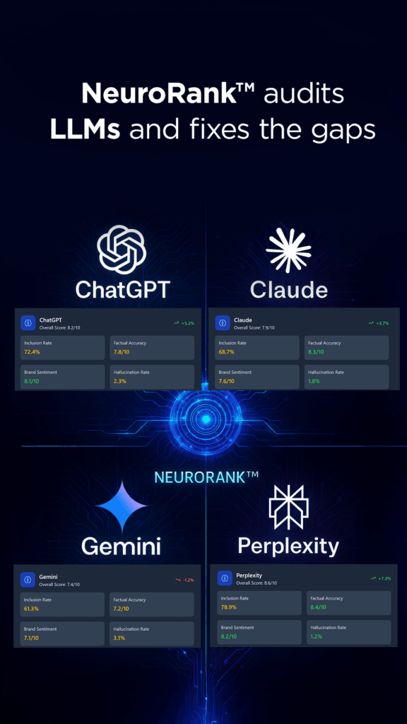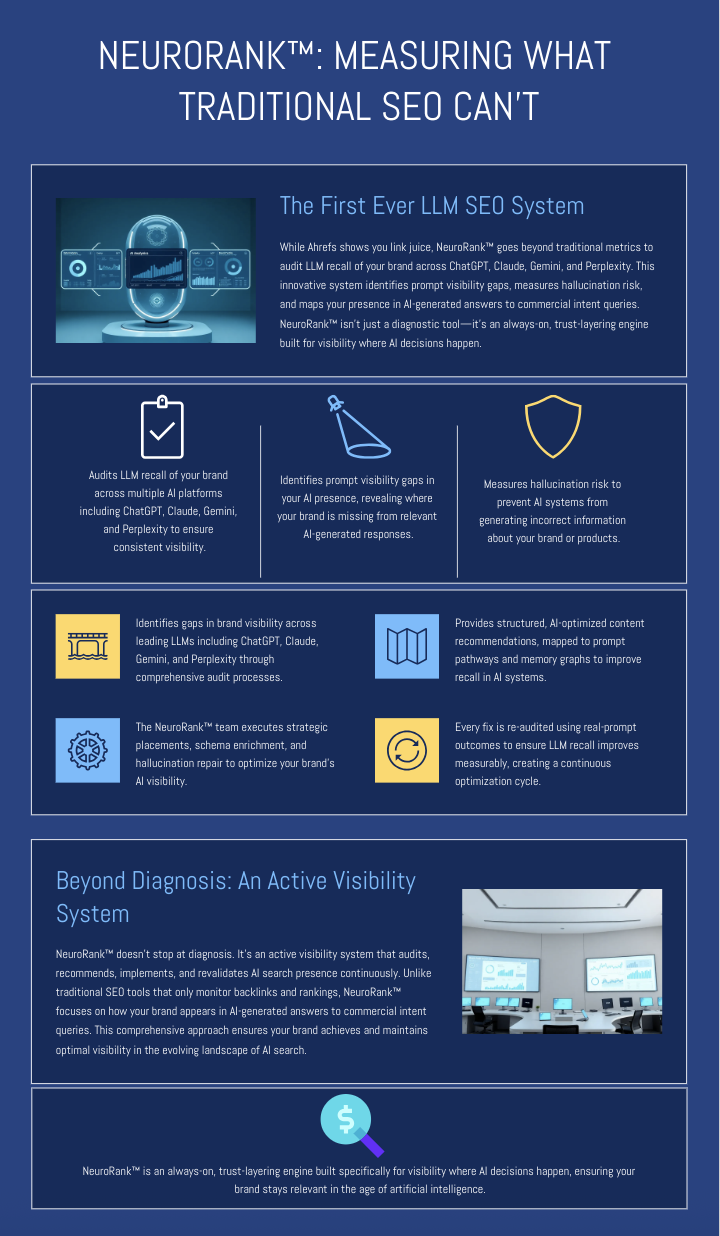 NeuroRank™ isn’t just a diagnostic-it’s an always-on, trust-layering engine built for visibility where AI decisions happen.