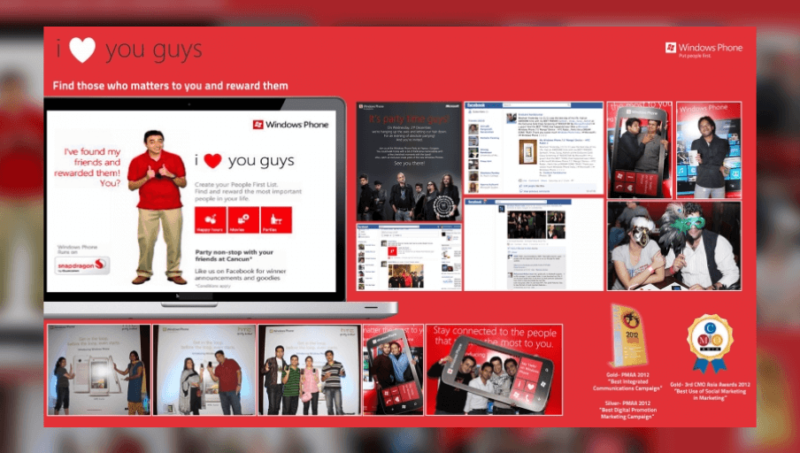 Solution: “Windows Phone helps you connect and celebrate with people who matter most to you” is the thought that stemmed from the insight that there are people who really matter to you, more than others. They are in your Address book, on your Social networks and all around you; identify them, tell them how important they are to you and reward them. The Windows phone lets you connect with those who matter and say “I LOVE YOU GUYS”. The campaign rooted itself in the delightful process of finding those who matter most and rewarding them with unique experiences.