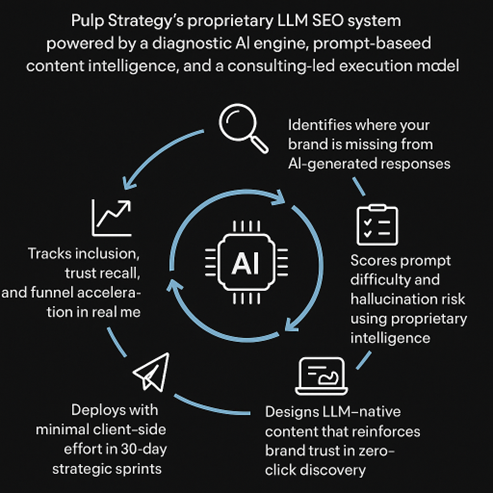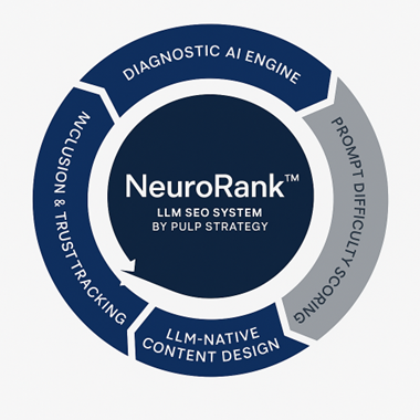 NeuroRank™ is Pulp Strategy’s proprietary LLM SEO system, powered by a diagnostic AI engine, prompt-based content intelligence, and a consulting-led execution model, designed to make your brand discoverable, memorable, and favored by large language models like ChatGPT, Gemini, Claude, and Perplexity.