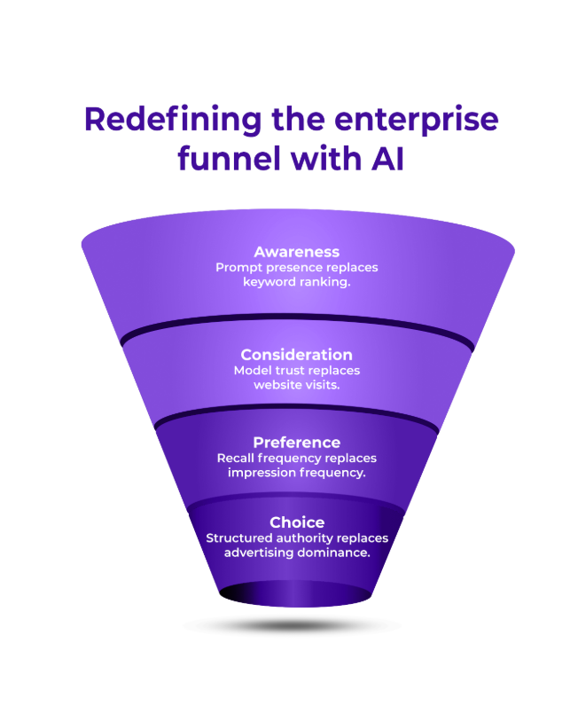 Enterprise buyers now ask LLMs comparative, diagnostic, and category-level queries. If the brand is not recalled in the model layer, it is excluded before traditional marketing touchpoints even activate.
