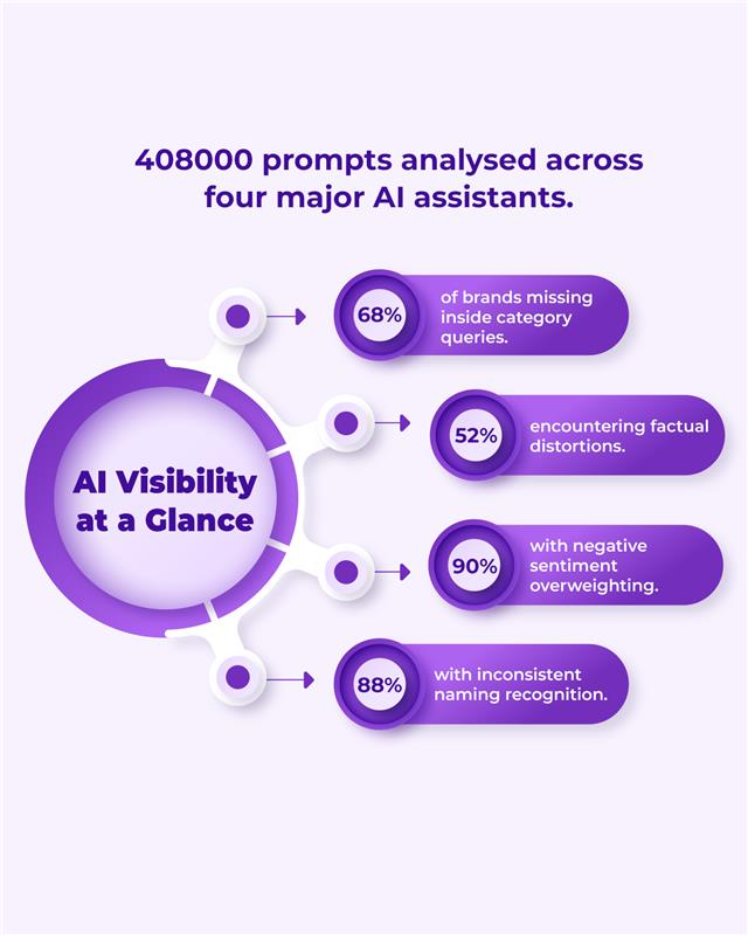 This article draws entirely from Pulp Strategy’s GEO Benchmark Index 2025, powered by NeuroRank™. The research includes 70 full‑spectrum GEO audits, 350 cross‑industry brands, 408000 real prompt simulations, and more than 60 anonymised CMO and CXO interviews. The findings reveal quantifiable disruption: 68 percent of brands are invisible in category answers, 52 percent face factual inaccuracies, 90 percent encounter negative sentiment overweighting, and 88 percent experience inconsistent naming or recognition across AI models. These findings represent the first large‑scale empirical map of how AI search interprets brand authority.