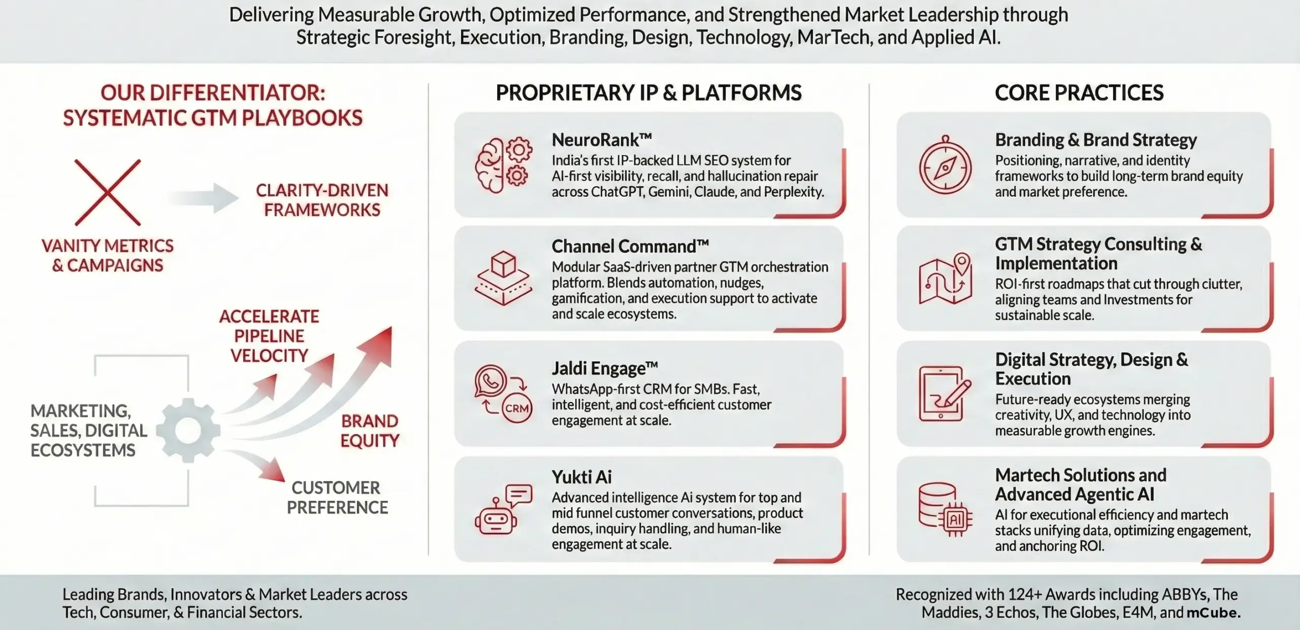 The strategy layer, the traditional execution and go to market, led with Digital, social, content, GEO and martech services, Our proprietary platforms, NeuroRank™, Channel Command™, Jaldi Engage™, and Yukti, exist to reduce execution friction and ensure learning compounds rather than resets.