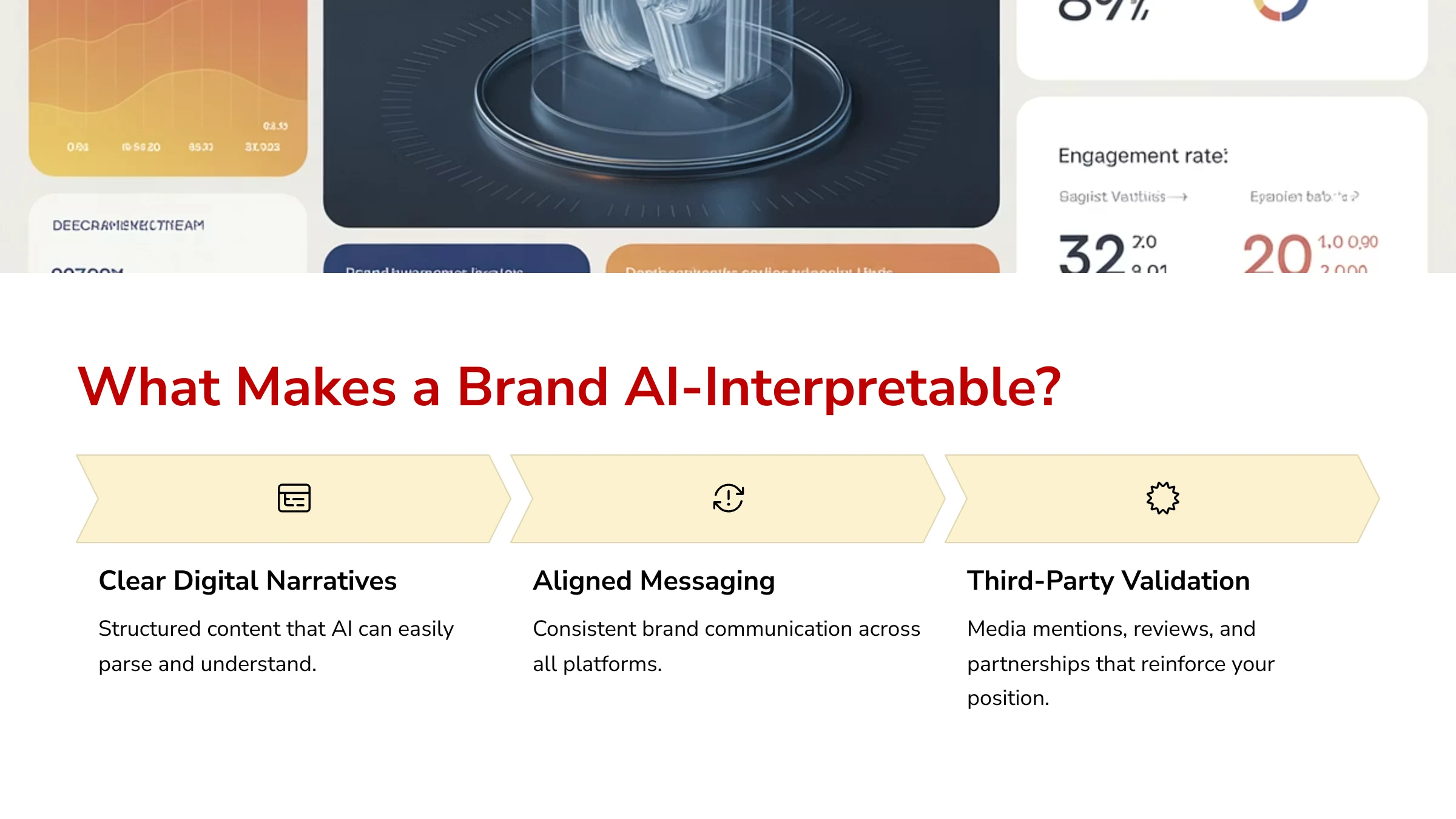 | Brand C | 65/100 | Trending on Perplexity | "Innovator – AI CRM" | Narrative-led advantage |