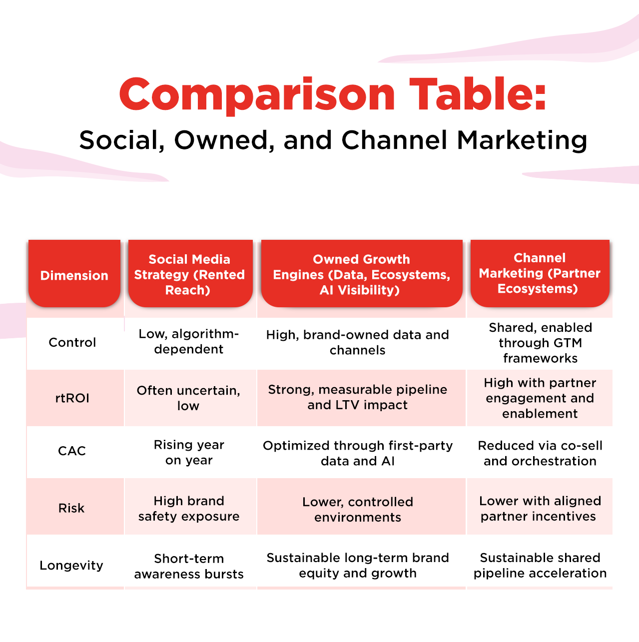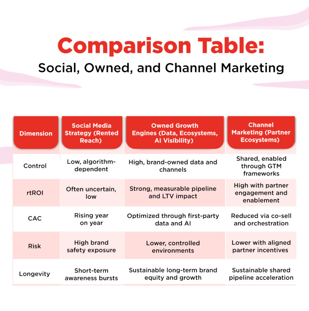 | Dimension | Social Media Strategy (Rented Reach) | Owned Growth Engines (Data, Ecosystems, AI Visibility) | Channel Marketing (Partner Ecosystems) |