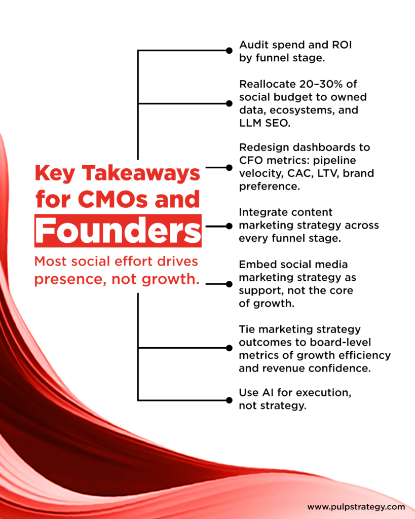 - Reallocate 20–30% of social budget to owned data, ecosystems, and LLM SEO.