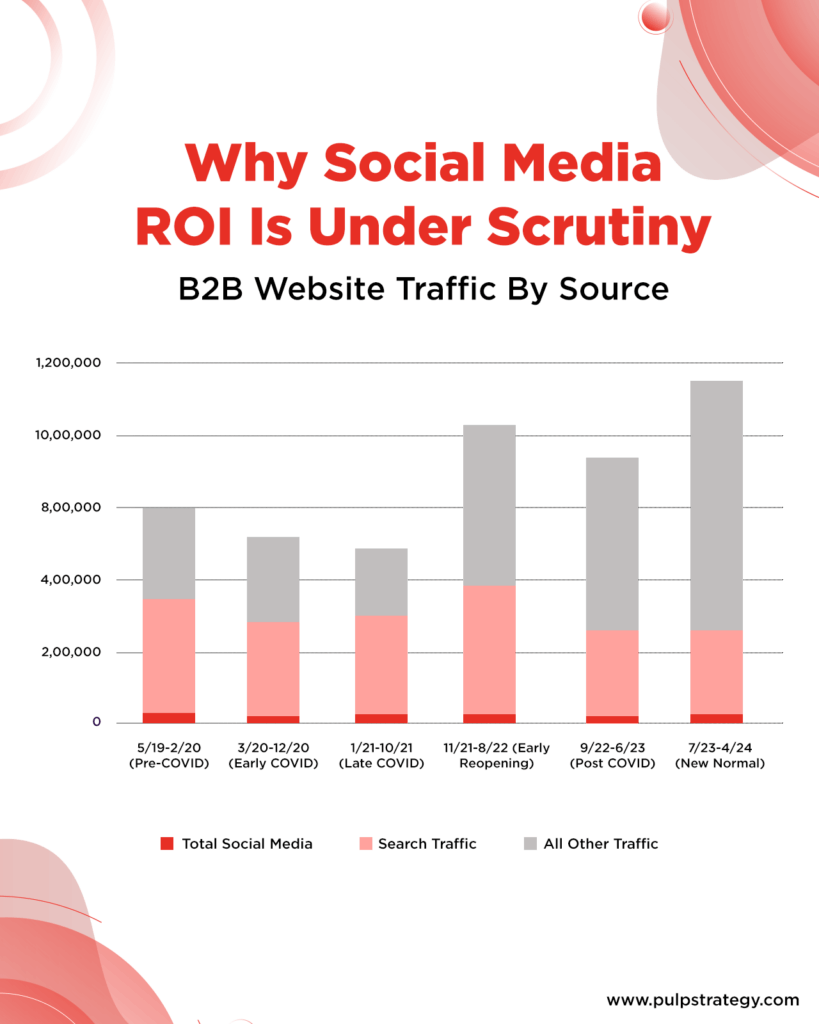 In B2B, social media in marketing contributes a low single-digit share of traffic. Between 2019–2024, social’s share dropped from ~3% to ~1% Forrester emphasizes the pivot to bottom-line accountability. The bottom line is that over the past five years, the share of total B2B site traffic from organic search has fallen from 39% to 27% , in 2024 and with Ai search its in free fall for most websites. Traffic from social media fell from 3% to 1%, while the share from “all other” sources has grown from 58% to 72%.