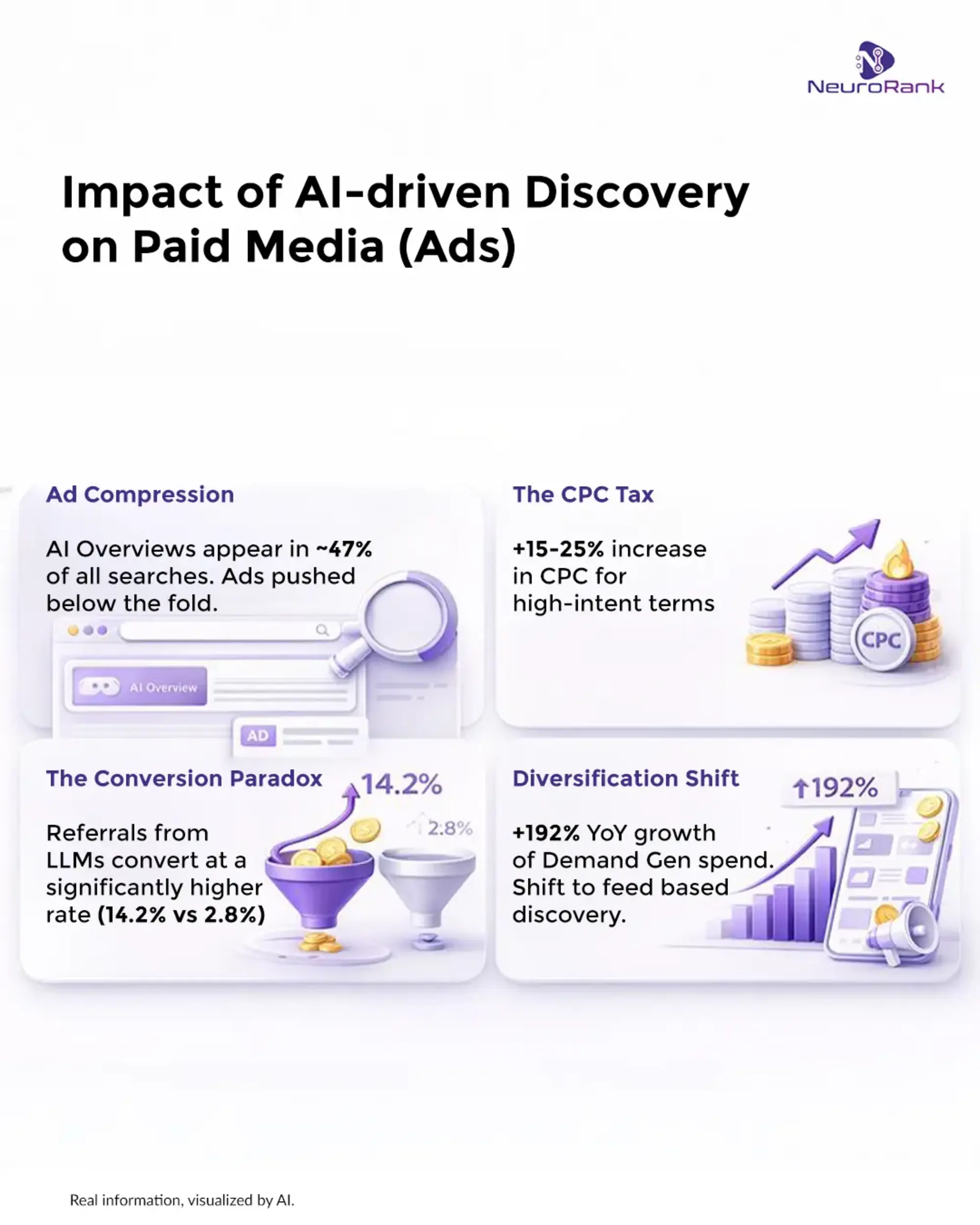 The fundamental architecture of digital discovery has shifted from a "keyword-match" model to a "synthesis-first" model. As Google rolls out Query Fan-Out and AI Overviews, the majority of informational and consideration-phase search queries are being resolved within the LLM interface itself. Brands that are not optimized for Large Language Model Optimization (LLMO) are facing an "invisible auction" crisis: their ads are being served for intent that the AI has already satisfied with a competitor’s synthesis. This article explores why traditional SEO and SEM are failing, the 20% to 50% drop in organic traffic, and how the NeuroRank™ framework allows brands to reclaim visibility by engineering content for model cognition and AI SEO.