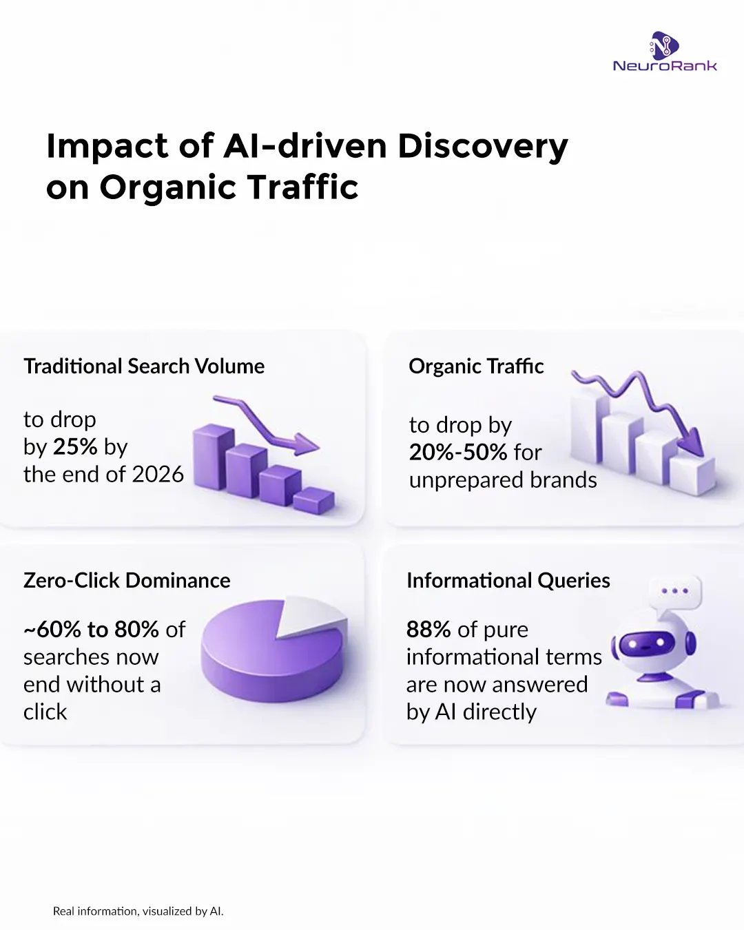 - Organic traffic for unoptimized brands is projected to drop by up to 50% through 2026.